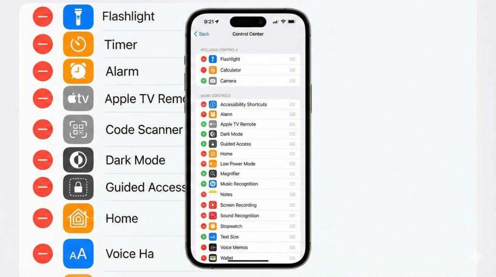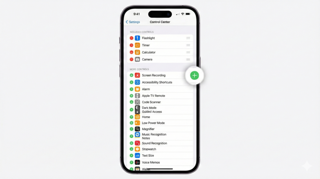 Inside Control Center, scroll down and find Screen Recording. Tap the plus (+) icon next to it to add Screen Recording to your Control Center.